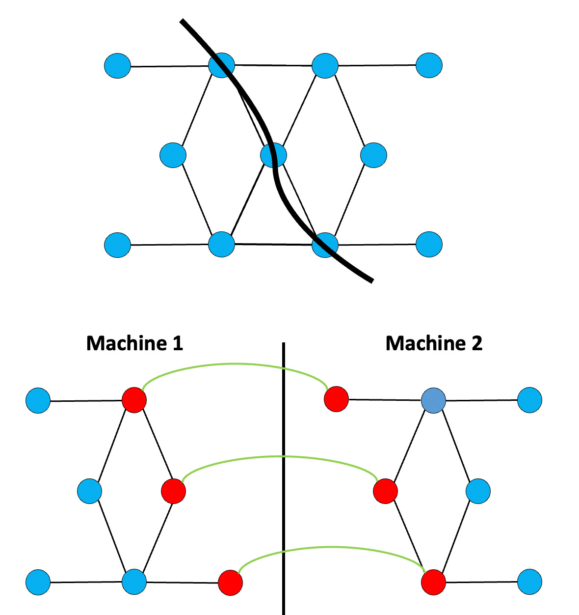 This is nice and intuitive as we normally think about vertices as “entities” (ex: webpages) and so the idea of partitioning the graph using vertices is pretty easy. The red nodes indicate “ghost vertices”, which is a bit of metadata that indicate that “this vertex is on this other machine”. The memory consumption on each machine is therefore the number of vertices it is assigned, plus the set of ghost vertices.