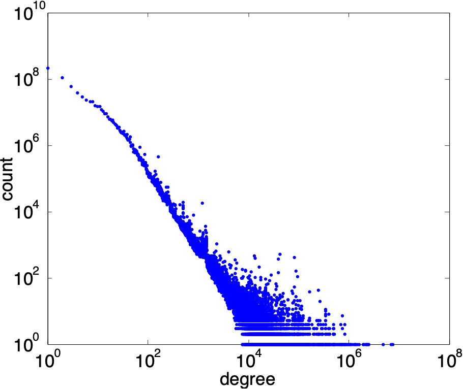 Above is the degree distribution of the Yahoo! Altavista Web Graph 2002 (1.4B vertices 6.7B edges). These graphs do not partition well. Notably the top 100 vertices cover 1% of the edges, and the top 1% of the vertices cover 53% of the edges. These graphs do not partition well and are inherently extremely inbalanced.